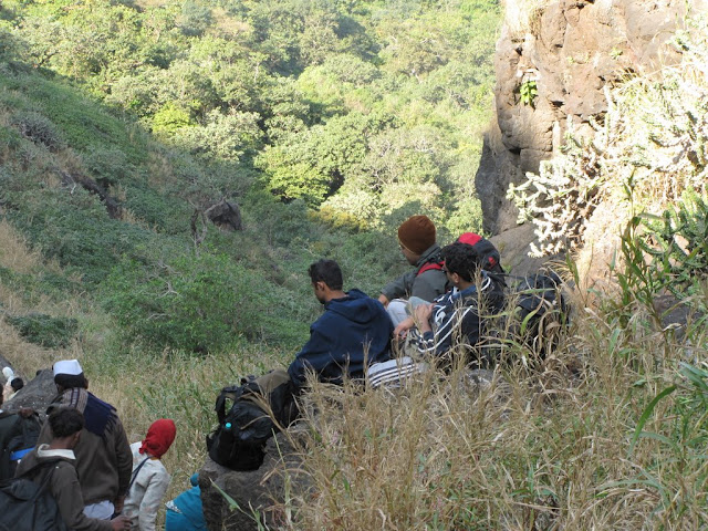 So again we started on our way. The way till the rock face is similar to Rawlya if not steeper in some places & with as much scree. Once at the face, the route was much easier. As we neared the left side of the fort, we saw some half finished rock cut caves & at the extreme left a underground water tank. We started looking for the steps.. and bless us all try as we did.. we could not find any ! So thinking that the route might be further ahead we went all the way around to the other sides ( the fort has a roughly triangular base) but no luck. Very disappointed, we started on our way back...